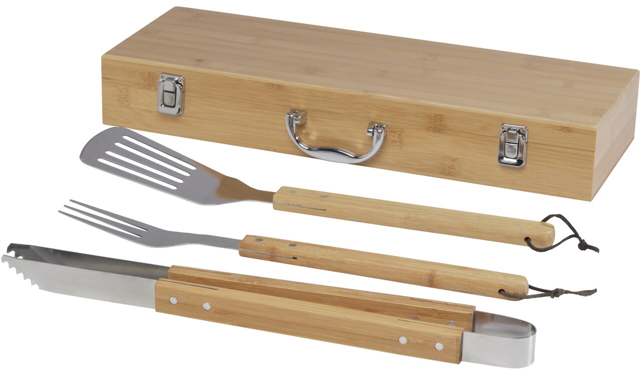 Bambusová třídílná grilovací sada Assadus. Obsahuje obracečku (42 × 9,5 cm), kleště (46 × 2,2 cm) a vidličku (43 × 3,2 cm). Sada je dodávána v bambusové krabičce (51,5 × 18,2 × 7,2 cm). Rukojeti a krabička jsou vyrobeny z bambusu, který se získává a vyrábí v souladu se zásadami udržitelnosti.