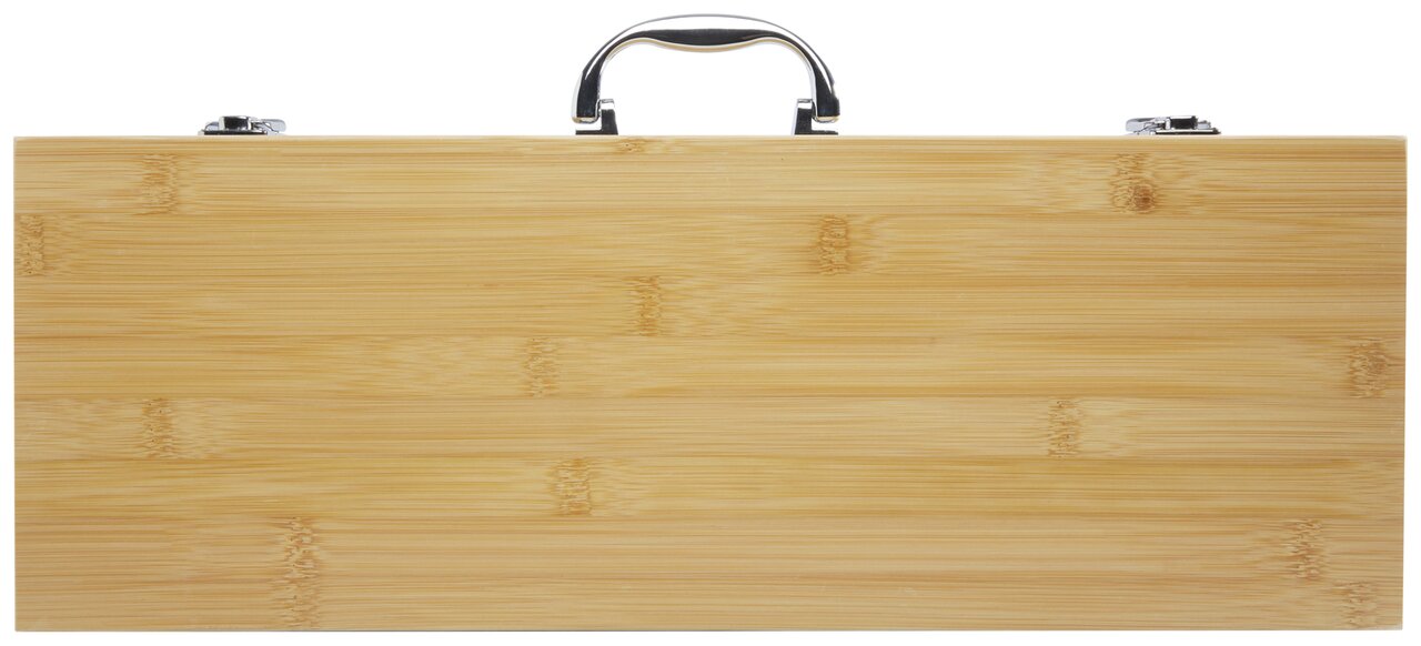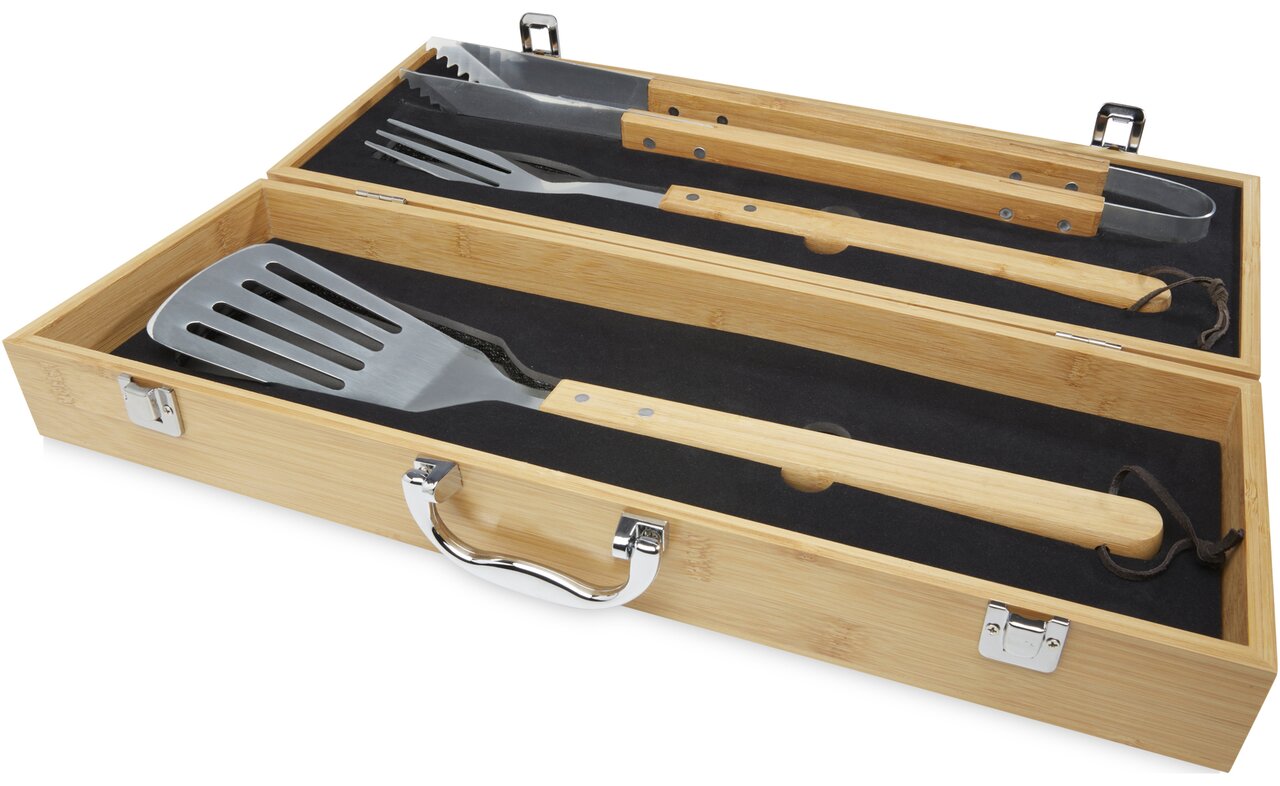 Bambusová třídílná grilovací sada Assadus. Obsahuje obracečku (42 × 9,5 cm), kleště (46 × 2,2 cm) a vidličku (43 × 3,2 cm). Sada je dodávána v bambusové krabičce (51,5 × 18,2 × 7,2 cm). Rukojeti a krabička jsou vyrobeny z bambusu, který se získává a vyrábí v souladu se zásadami udržitelnosti.
