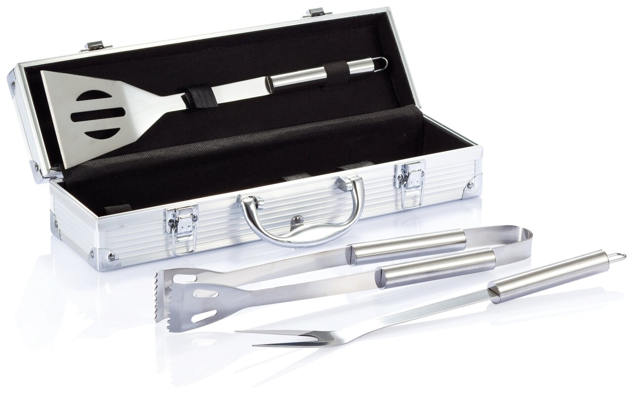 Sada nástrojů o 3 dílech na grilování z nerezové oceli. Součástí je obracečka, porcovací vidlička s ochrannou krytkou a kleště. Rukojeť také z nerezové oceli. Vše uschováno v hliníkovém kufříku s panty a uchem.