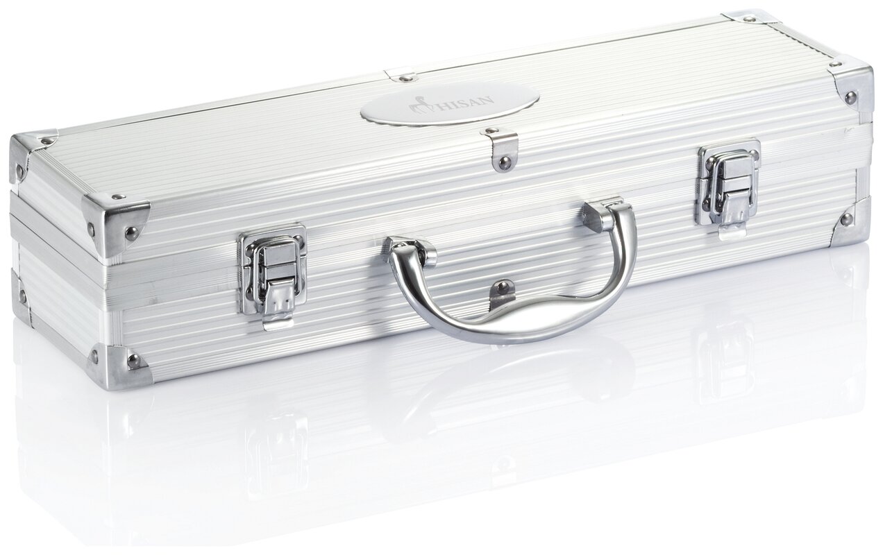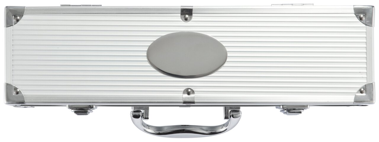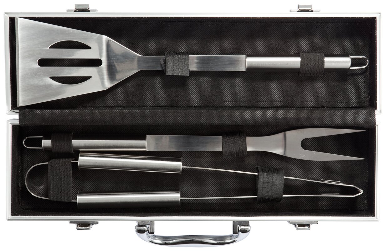 Sada nástrojů o 3 dílech na grilování z nerezové oceli. Součástí je obracečka, porcovací vidlička s ochrannou krytkou a kleště. Rukojeť také z nerezové oceli. Vše uschováno v hliníkovém kufříku s panty a uchem.