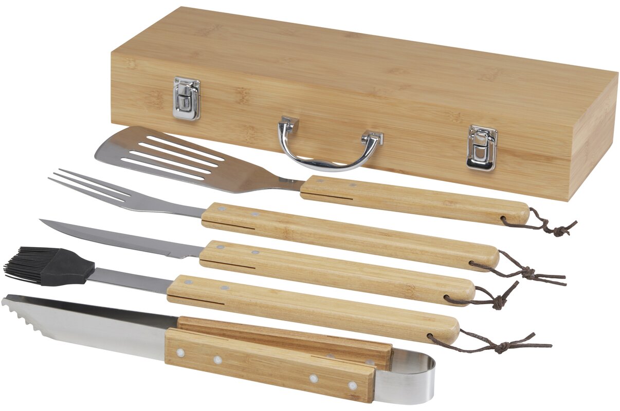 Bambusová 5dílná grilovací sada Churras. Obsahuje obracečku (40 ×9,5 cm), kleště (34,5 × 6 cm), vidličku (38,5 x 3 cm), nůž (38,5 × 3 cm) a marinovací štětec (38 × 4,3 cm). Sada je dodávána v bambusové krabičce (46 × 16,2 × 7,4 cm). Rukojeti a dárková krabička jsou vyrobeny z bambusu, který se získává a vyrábí v souladu se zásadami udržitelnosti.