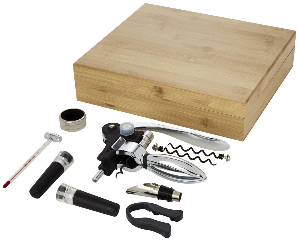 9dílná sada na víno Malbick. Kterou tvoří 1 vývrtka, 2 zátky, 1 nálevka, 1 kroužek, 1 řezačka fólií, 1 teploměr a 2 náhradní vývrtky. Dodává se v bambusové dárkové krabičce vyrobené v souladu se zásadami udržitelnosti.