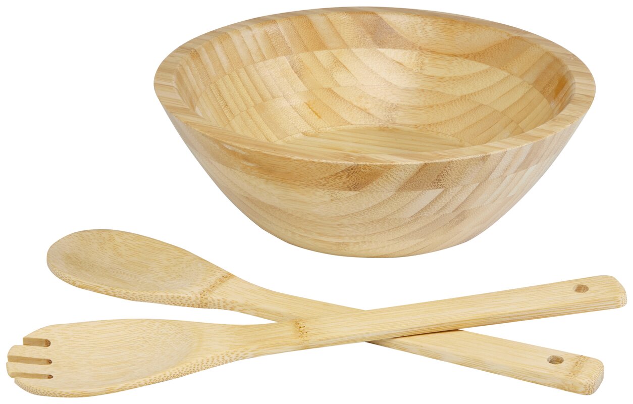 Bambusová salátová sada s klasickou kulatou mísou, salátovou lžící a vidličkou na salát, která je praktická pro každodenní rodinné večeře. Použitý bambus se získává a vyrábí v souladu se zásadami udržitelnosti.
