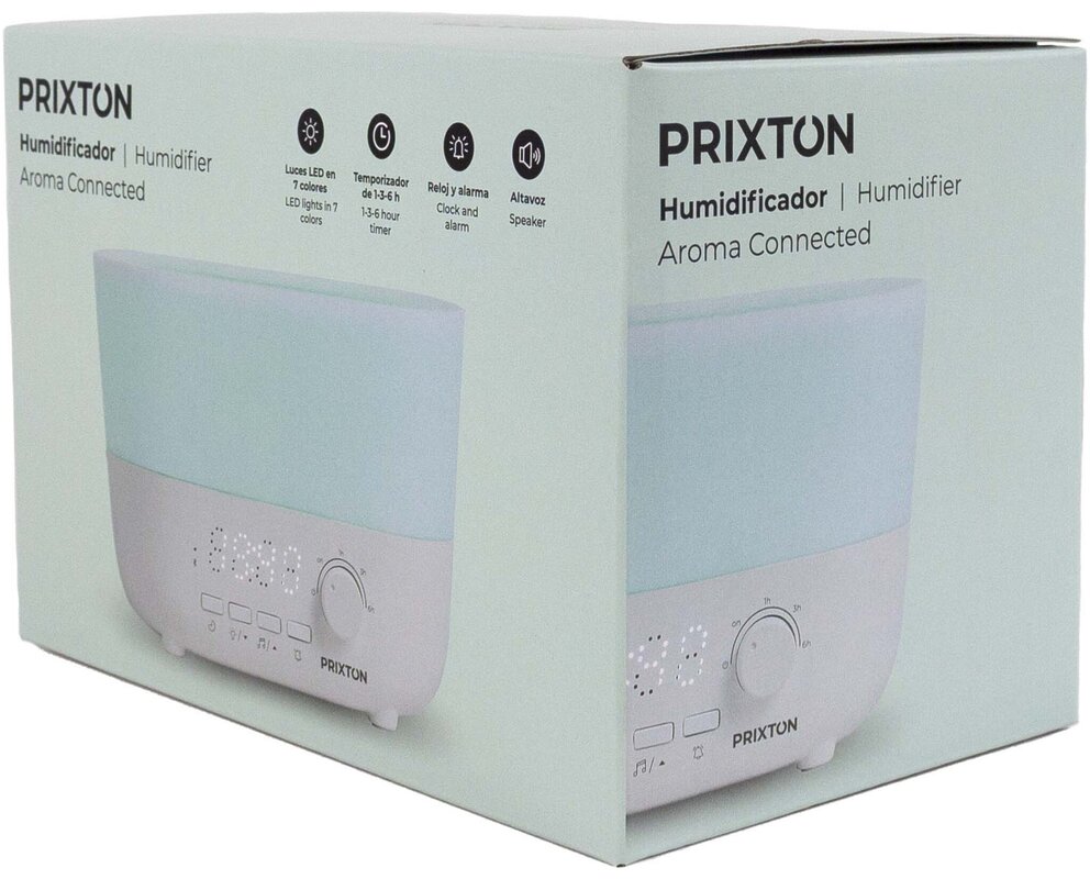 Aroma difuzér 4v1 Prixton Connected kombinuje zvlhčovač, 12W Bluetooth® reproduktor, hodiny a budík v jednom zařízení, ideální pro firemní potisk. Nádrž 360ml s flexibilními režimy (nepřetržitý nebo časované 1/3/6 hodin) a automatickým vypnutím. Reproduktor umožňuje streamování hudby přímo z vašich zařízení. Adaptér 100–240V součástí.