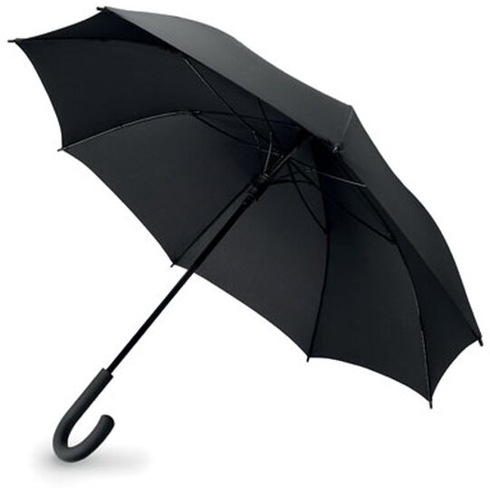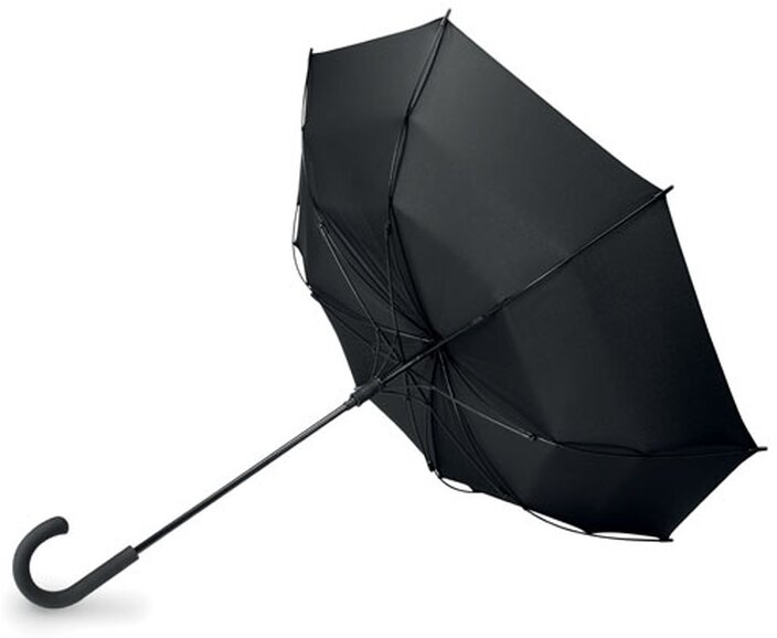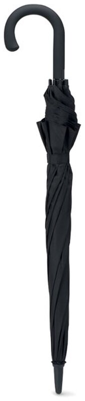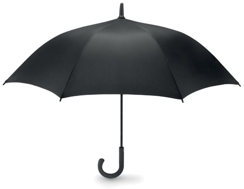 23" deštník s automatickým otevíráním s černým kovovým tělem a potahem vyrobený z příjemné 190T ponžé. Konstrukci tvoří černá sklolaminátová žebra, černé plastové koncovky a černé tvarované držadlo z ABS se šedým tlačítkem pro otevření. Zavírání deštníku je řešeno manuálně.