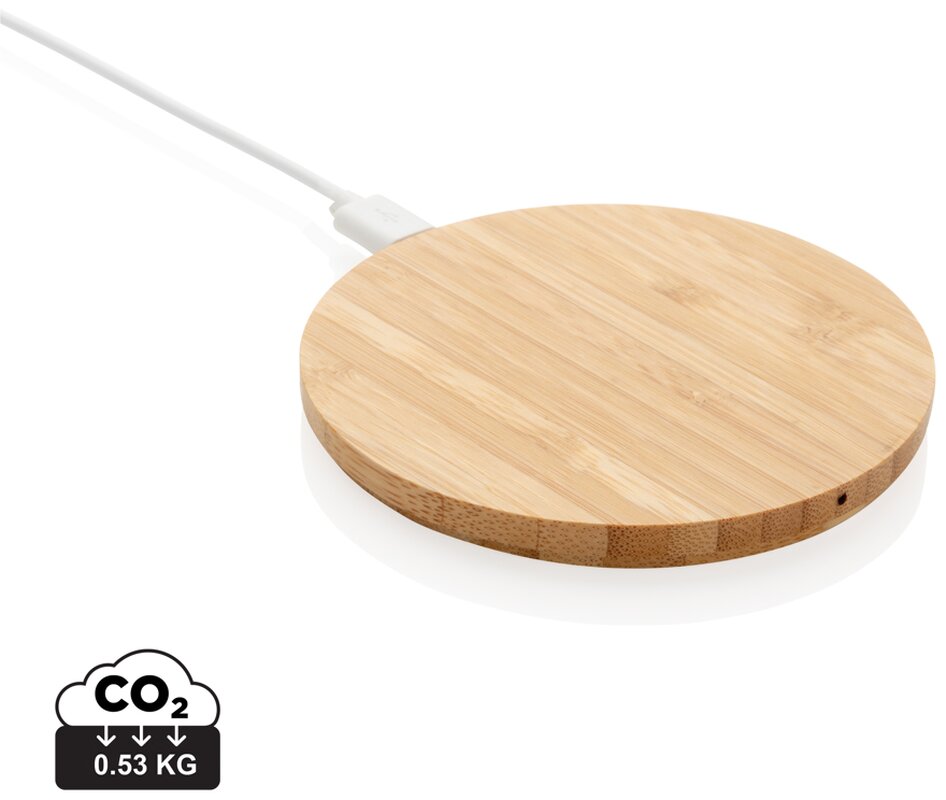 Bezdrátová nabíječka vyrobená ze 100 % FSC®certifikovaného bambusu. Kompatibilní se všemi zařízeními podporujícími Qi jako jsou nejnovější generace Android a iPhone 8 a výše. Vstup: 5V/2A; bezdrátový výstup: 5V/1A 5W. Součástí také 1,5m micro USB napájecí kabel z RCS recyklovaného TPE. Produkt i příslušenství bez PVC. Baleno v dárkové krabičce z FSC®papíru.