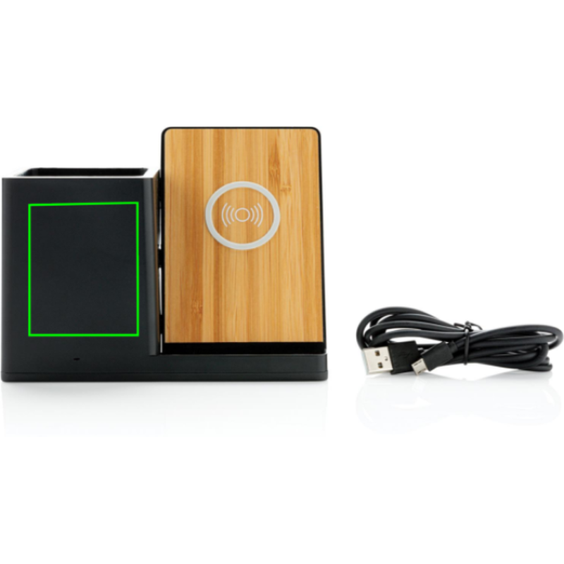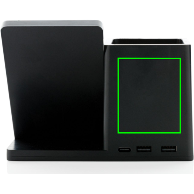 Rychlá bezdrátová nabíječka s výkonem 10 W se stojánekm na pera. Vyrobená z RCS recyklovaného ABS plastu. Obsahuje 2 USB výstupy na zadní straně pro nabíjení dalších zařízení, 120 cm USB C nabíjecí kabel z RCS recyklovaného TPE. Produkt je kompatibilní se všemi zařízeními podporujícími Qi jako jsou nejnovější generace Android a iPhone 8 a výše. Vstup USB C: 5V/2A, 9V/2A. Bezdrátový výstup: 5V/1A, 9V/1,1A 10 WCelkový podíl recyklátu dle váhy produktu: 78 %. Oblast bezdrátového nabíjení je vyrobená ze 100 % FSC® bambusu. Výrobek je zabalen v FSC® dárkové krabičce.