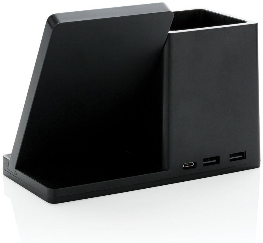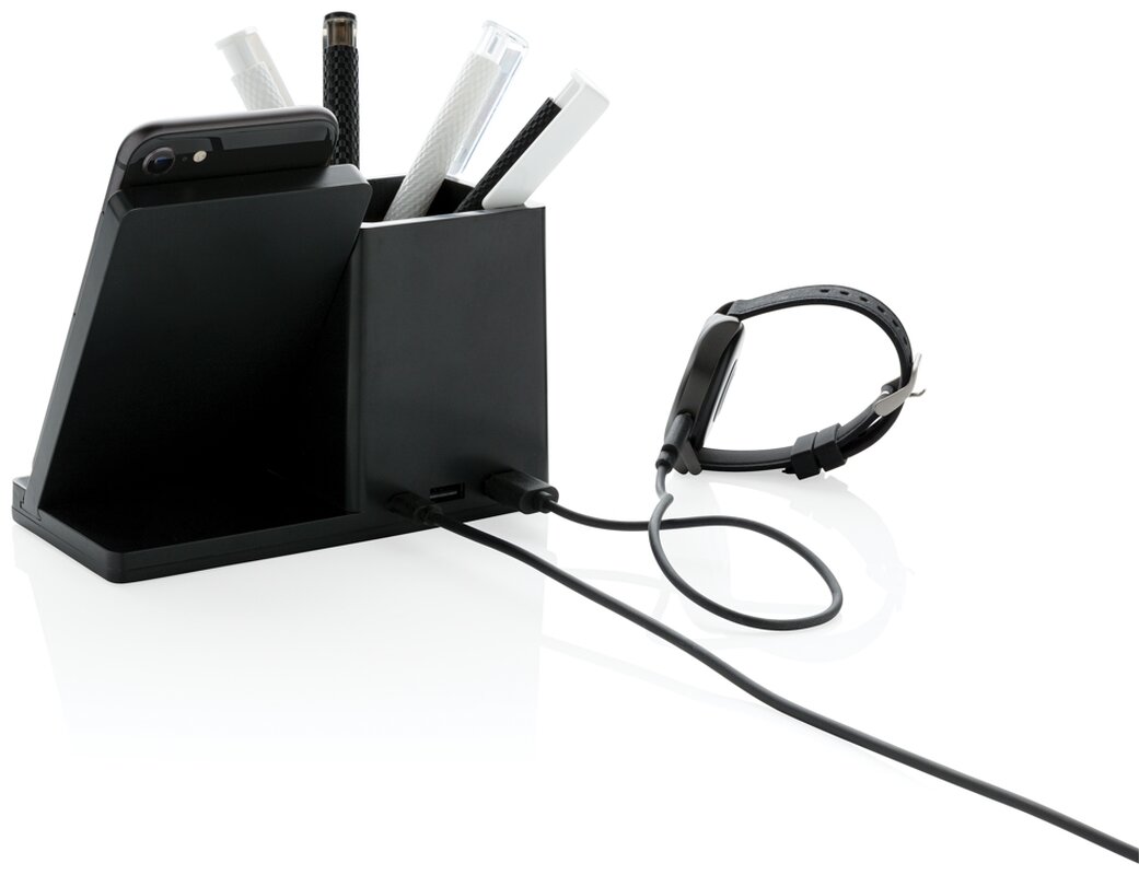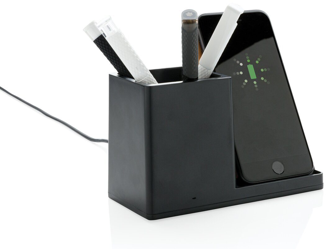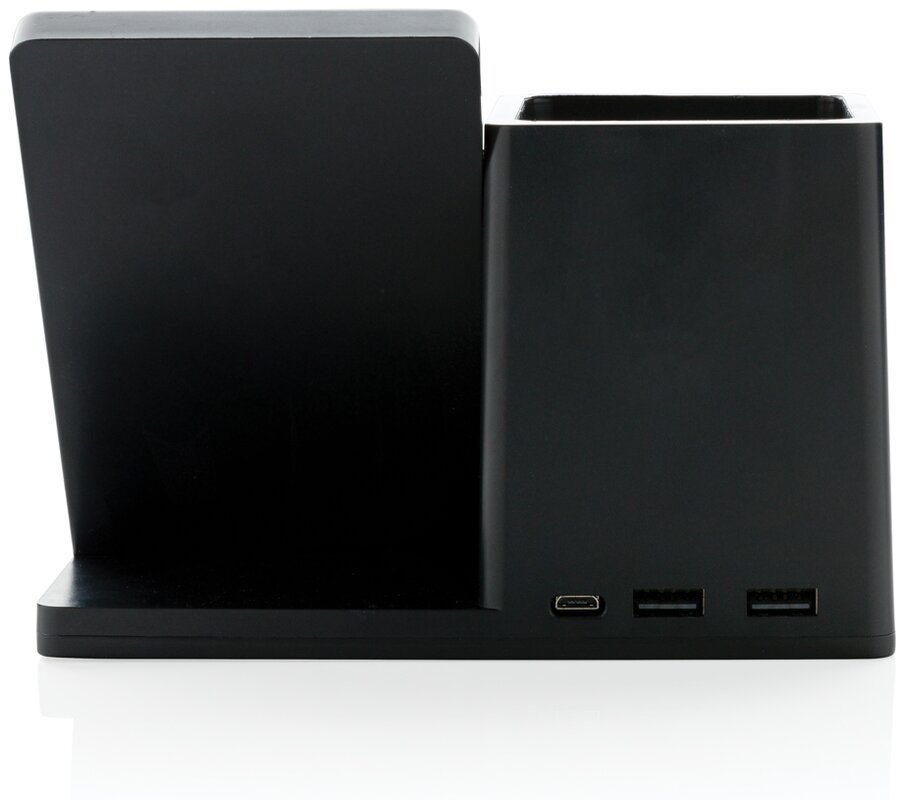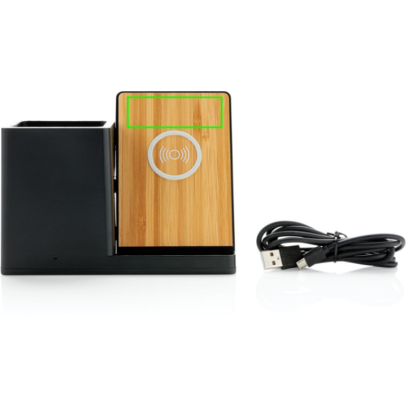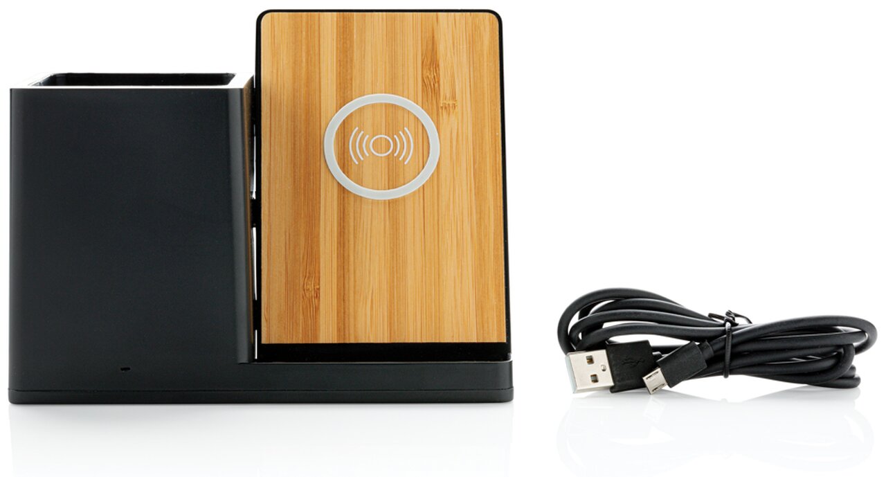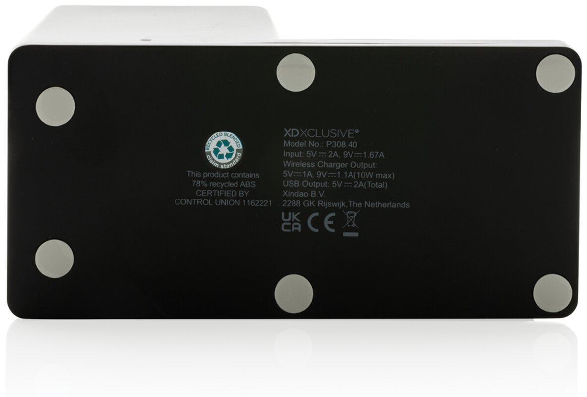 Rychlá bezdrátová nabíječka s výkonem 10 W se stojánekm na pera. Vyrobená z RCS recyklovaného ABS plastu. Obsahuje 2 USB výstupy na zadní straně pro nabíjení dalších zařízení, 120 cm USB C nabíjecí kabel z RCS recyklovaného TPE. Produkt je kompatibilní se všemi zařízeními podporujícími Qi jako jsou nejnovější generace Android a iPhone 8 a výše. Vstup USB C: 5V/2A, 9V/2A. Bezdrátový výstup: 5V/1A, 9V/1,1A 10 WCelkový podíl recyklátu dle váhy produktu: 78 %. Oblast bezdrátového nabíjení je vyrobená ze 100 % FSC® bambusu. Výrobek je zabalen v FSC® dárkové krabičce.