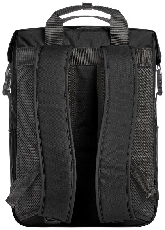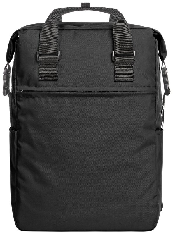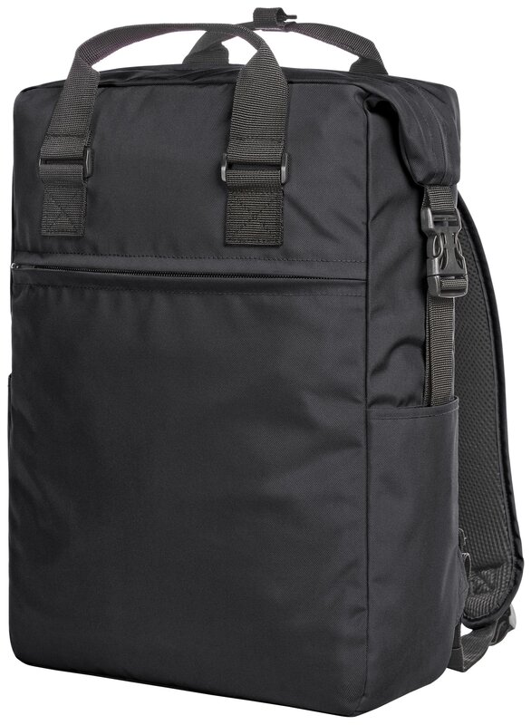 Elegantní obdélníkový batoh obsahující: prostornou hlavní přihrádku s 2cestným zipem, polstrovanou přihrádku na notebook, plochou kapsu uvnitř, boční přezky pro pohodlné otevírání a které lze spojit jako držadlo velkou přední kapsu na zip, dvě boční kapsy například na láhve s pitím. Má také polstrovaný systém přenášení. Produkt je vyroben z vrchového materiálu RPET.
