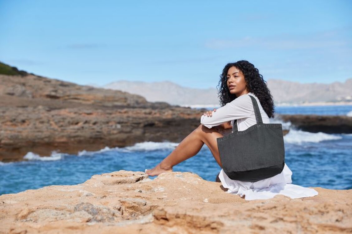 Praktická taška s oválným dnem a dlouhými uchy nabízí dostatek prostoru pro každodenní nákupy i volnočasové aktivity. Díky výrobě z 340 g/m² certifikované recyklované bavlny je nejen pevná a odolná, ale i šetrná k životnímu prostředí. Barevný vzhled je výsledkem individuálního barvení po kusech, což dodává každému kusu originální charakter.