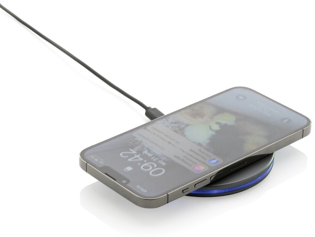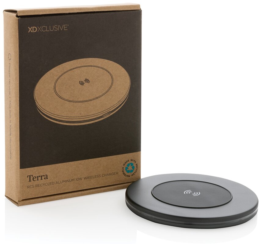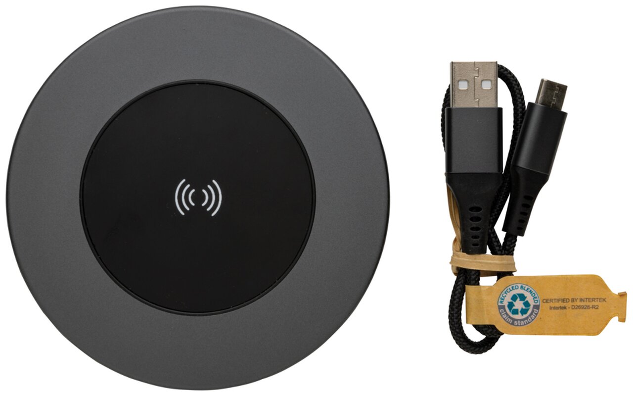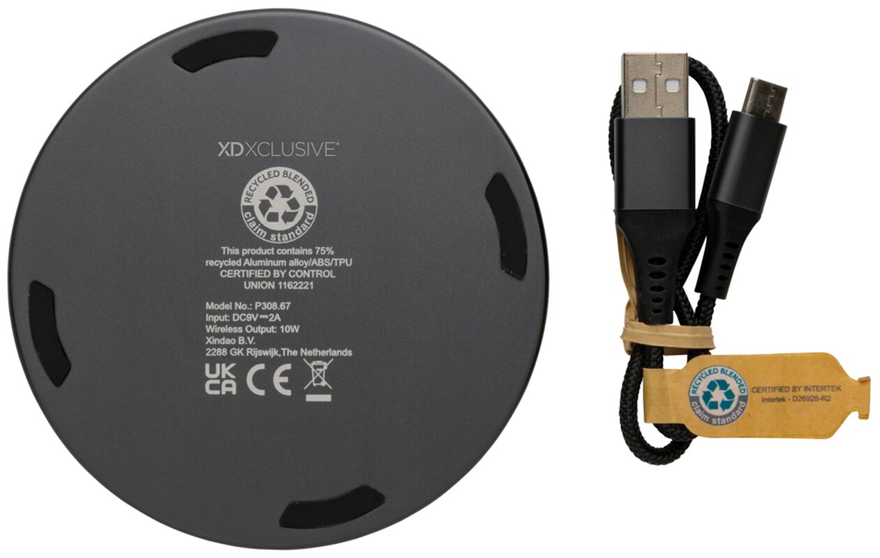 Bezdrátová nabíječka s výkonem 10 W vyrobená z recyklovaného hliníku, ABS a TPE s RCS certifikací. RCS (Recycled Claim Standard) je globální standard, který umožňuje ověřit použití recyklovaného materiálu v produktu napříč celým dodavatelským řetězcem. Celkový podíl recyklátu dle váhy produktu: 75 %. Hliník při recyklaci nijak neztrácí své vlastnosti, lze jej tedy opakovaně recyklovat. Včetně 120 cm dlouhého USB C nabíjecího kabelu z RCS recyklovaného hliníku, TPE a PET. Vstup: 9V/2A, výstup 9V/1,1A. Baleno v FSC® dárkové krabičce.