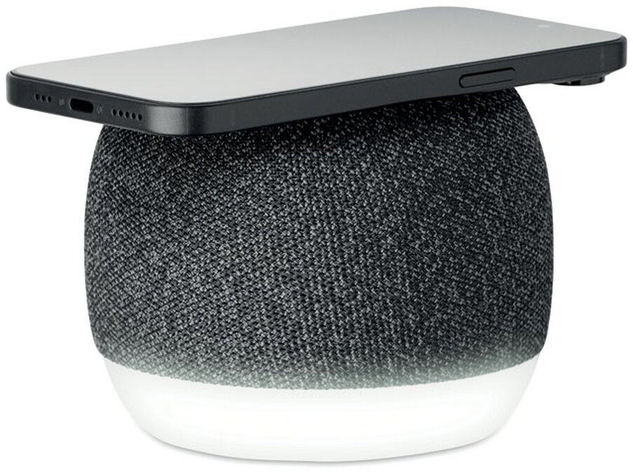 Bezdrátový 5.0 reproduktor a 15W bezdrátová nabíječka z ABS a RPET tkaniny s černýn bambusem na horní straně a základnou se světem. Obsahuje 1 dobíjecí baterii Li-ION 1200 mAh, port pro SD kartu a kabel AUX/USB. Výstupní data: 5W, 3 Ohm a 5V. Doba přehrávání cca 3 h.