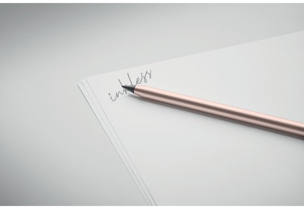 Propiska z recyklovaného hliníku s hrotem pro nekonečné psaní. Hrot pera je z kovové slitiny, který píše díky oxidaci s papírem, hrot se neopotřebovává, není třeba měnit ani ořezávat. Součástí je plastová krytka hrotu.