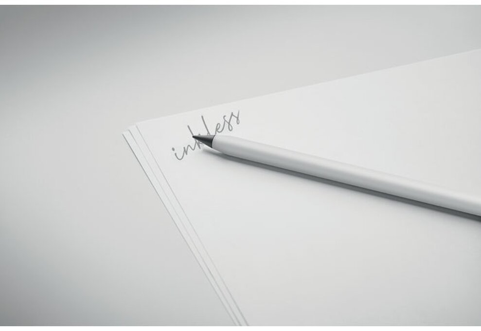 Propiska z recyklovaného hliníku s hrotem pro nekonečné psaní. Hrot pera je z kovové slitiny, který píše díky oxidaci s papírem, hrot se neopotřebovává, není třeba měnit ani ořezávat. Součástí je plastová krytka hrotu.