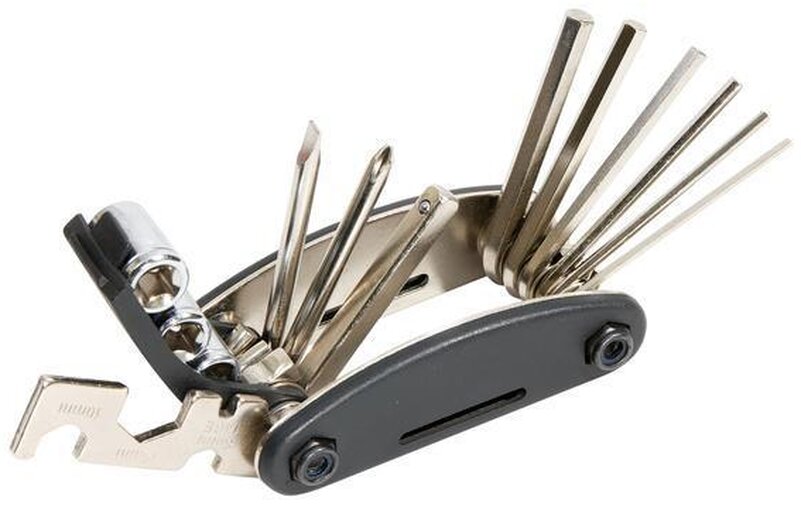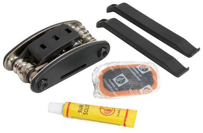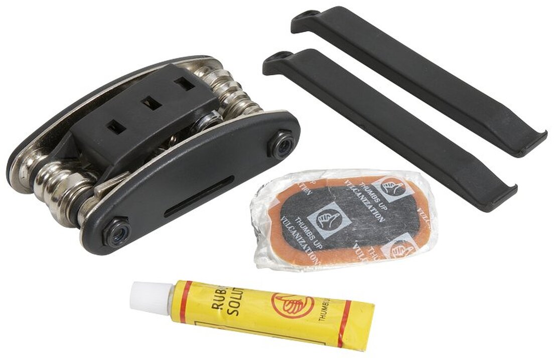 Sada cyklistického nářadí z kovu a plastu v polyesterovém pouzdře. Sada nářadí obsahuje: sadu na opravu duší (páčky na pneumatiky a 9 ks záplat na duše s lepidlem), sadu 3 nástrčných klíčů, plochý šroubovák, křížový šroubovák, 6 inbusových klíčů, plochý klíč 3 velikostí, klíč na paprsky 14G.