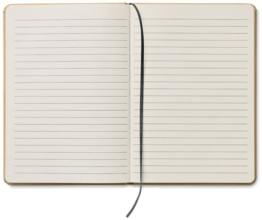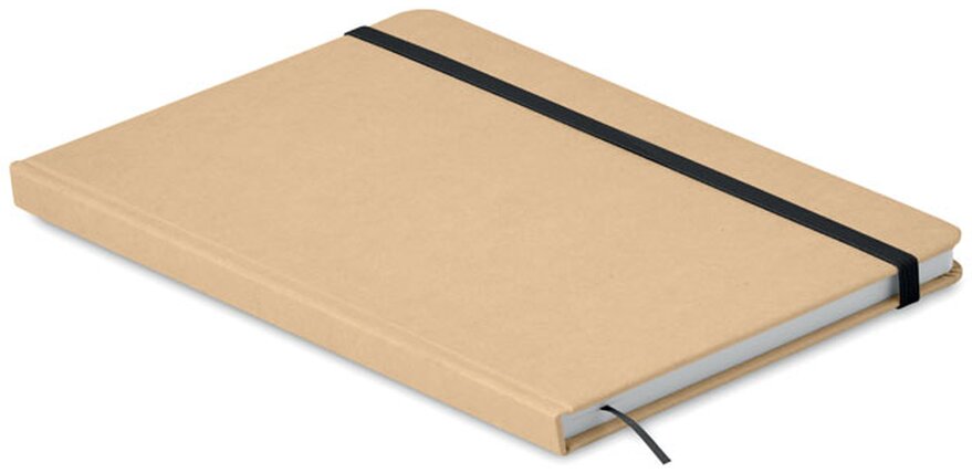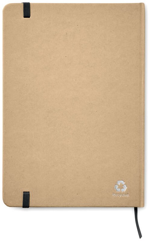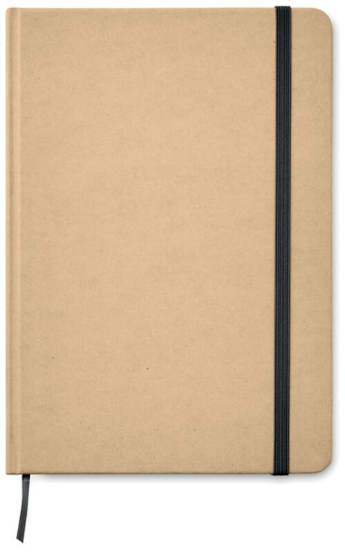 Zápisník A5 s tvrdými deskami z recyklovaného kartonu, 160 linkovaných stránek (80 listů) recyklovaného papíru, barevná záložka a gumička.