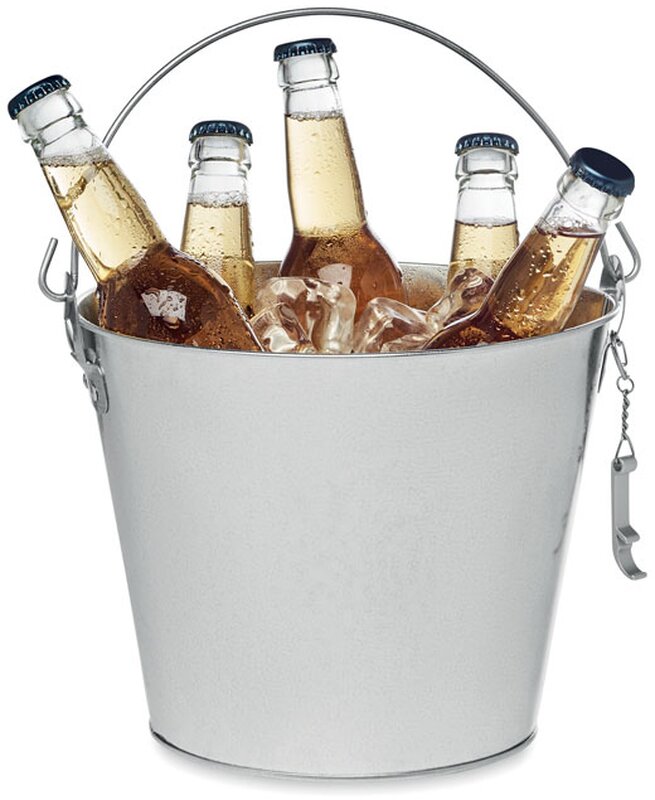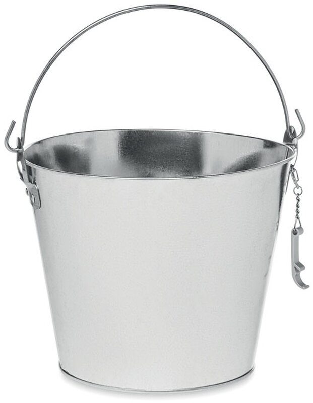 Kovový kbelík na piva nebo jiné nápoje. Dražadla a otvírák. Objem: 4l