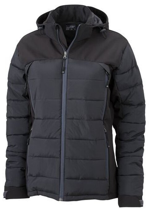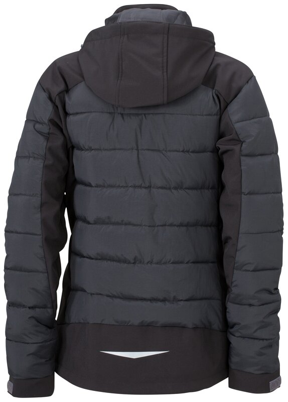 Dámská bunda James & Nicholson Ladies Outdoor Hybridjacket. Termo bunda v atraktivním mixu materiálů. Vnější látka: 95% polyester, 5% elastan. Vnější látka 2: 100% polyamid. Podšívka: 100% polyester. Polstrovaní: 100% polyester. Bunda má polstrovaná záda, elastické softshellové vložky, je větru odolná a odpuzující vodu. Součástí bundy je odnímatelná, nastavitelná softshell kapuce, ochrana proti větru s ochranou na bradu, 4 přední kapsy s kontrastními zipy, vnitřní kapsa na zip, síťovaná kapsa uvnitř, reflexní potisk na zadní straně, elastická šňůra s uzávěrem na kapuci a lemu. Bunda je vypasovaná. Balení: 1/10 (ks v jednom sáčku / celkem ks v kartonu).