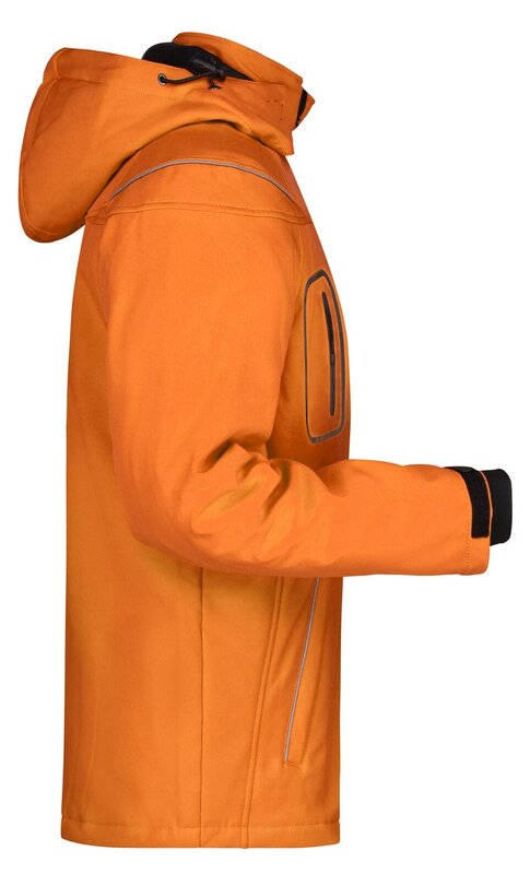 Módní zimní softshellová bunda James & Nicholson pro muže. Vnější materiál: 95% polyester, 5% elastan. Podšívka: 100% polyester. 3 vrstvy funkční tkaniny s TPU membránou. Bunda je větru a vodě odolná (5.000 mm vodního sloupce), prodyšná. Součástí bundy je odnímatelná, polstrovaná a lemovaná kapuce, teplý fleecový límec, zip pod rukávy pro další ventilaci, reflexní lemování na ramenou a přední kapse, 2 přední kapsy, 1 náprsní kapsa, vnitřní náprsní kapsa a kapsa na mobil, 2pásmový zip, elastická šňůra se zarážkami na pase a kapuce. Balení: 1/10 (ks v jednom sáčku / celkem ks v kartonu).
