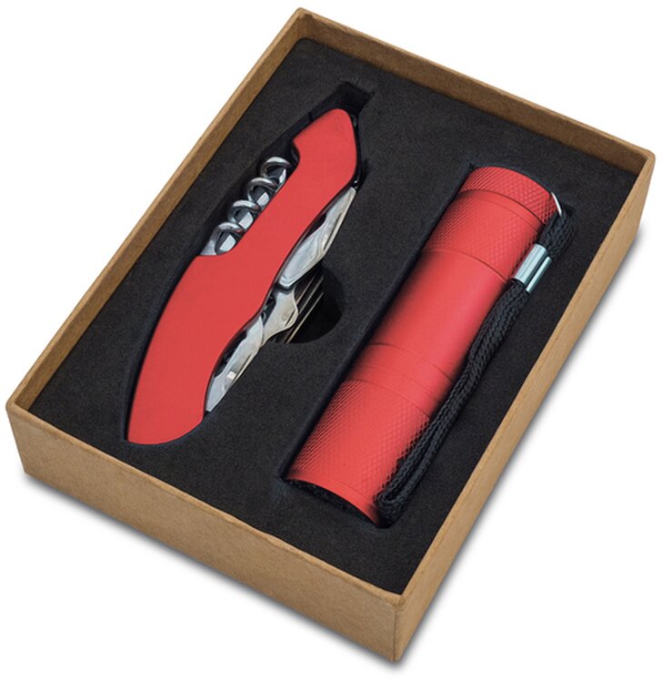 Sada skládající se ze svítilny s 9 LED a víceúčelového kapesního nože s 11 funkcemi - nůž, pilka, škrabka na ryby, nůžky, otvírák na láhve, otvírák na konzervy, děrovačka, pilník na nehty, křížový šroubovák, vývrtka, dláto). Baleno v kraftové krabičce.