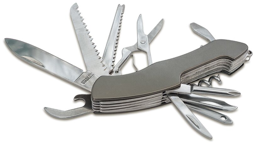 Sada skládající se ze svítilny s 9 LED a víceúčelového kapesního nože s 11 funkcemi - nůž, pilka, škrabka na ryby, nůžky, otvírák na láhve, otvírák na konzervy, děrovačka, pilník na nehty, křížový šroubovák, vývrtka, dláto). Baleno v kraftové krabičce.