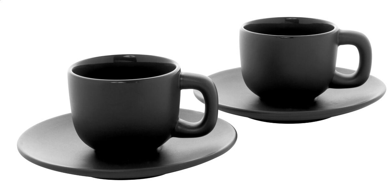 Vysoce kvalitní keramická sada šálků na cappuccino se 2 šálky a podšálky. S matnou vnější a lesklou vnitřní povrchovou úpravou. 200 ml. V kraftové papírové krabici.2 šálky a 2 podšálky – kompletní sada pro servírování espressa