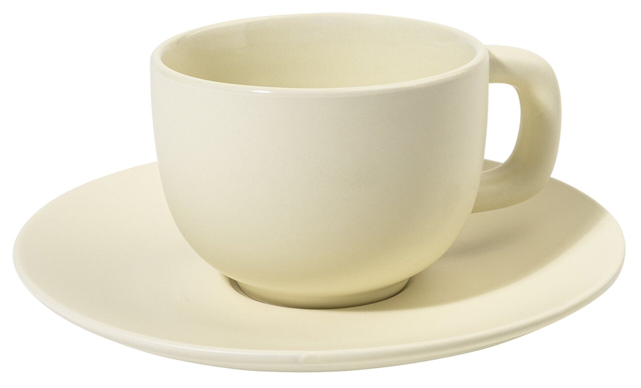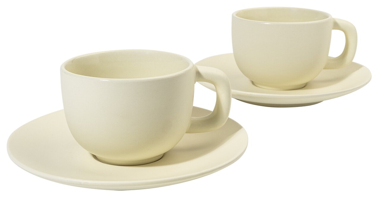 Vysoce kvalitní keramická sada šálků na cappuccino se 2 šálky a podšálky. S matnou vnější a lesklou vnitřní povrchovou úpravou. 200 ml. V kraftové papírové krabici.2 šálky a 2 podšálky – kompletní sada pro servírování espressa