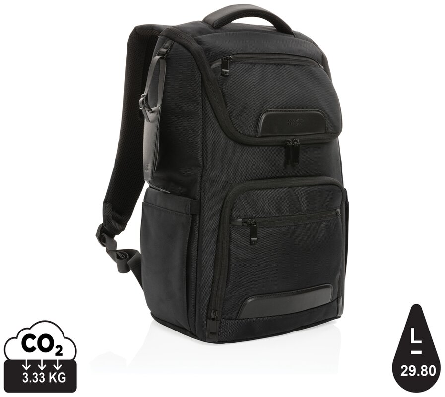 Elegantní skvěle vybavený batoh značky Swiss Peak pro každodenní cestování. Design je navržený prakticky s vysokým množstvím kapes, s prostorným hlavním oddílem, polstrovaným oddílem na 15,6" notebook a dodatečnou menší kapsou na zip. Také obsahuje USB výstup pro nabíjení telefonu na cestách, kapsy s RFID ochranou, poutka na pera, postranní kapsa na láhev a odnímatelný kontaktní štítek. Vyrobený z pevného recyklovaného polyesteru 1680D s bohatými detaily z umělé kůže.Složení: vnější část: 100 % 1680D recyklovaný polyester; vnitřní část (podšívka): 150D recyklovaný polyester. Včetně skenovatelné složky AWARE™ garantující obsah recyklátu. Na výrobu bylo využito 49,92 500ml PET lahví a bylo uspořeno 29,8 litrů vody. Z výtěžku každého prodaného produktu je navíc přispěno 2 % na podporu iniciativy Water.org.
