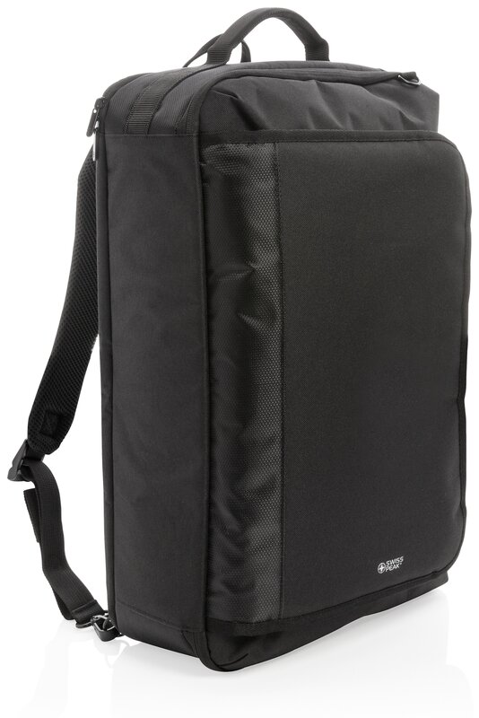 Objevte svět možností s originálním konvertibilním batohem Swiss Peak. Funkční organizace a business funkce vám zajistí, že se batoh stane každodenní volbou číslo jedna. Konvertibilita spočívá ve 4 možnostech nošení: 1. Batoh: připněte polstrované popruhy k bezpečnostním kroužkům a upravte si jejich délku dle potřeby. 2. Taška na rameno: odepněte a uschovejte popruhy na záda do příslušné kapsy. Poté připněte ramenní popruh. 3. Crossbody: po naplnění tašky upravte délku ramenního popruhu pro crossbody nošení umožňující pohodlnější a bezpečnější nošení. 4. Brašna: odepněte a uschovejte popruhy. Nošení v ruce je možné vrchním či postranním úchopem. Velký hlavní oddíl a přední kapsa na zip. Součástí jsou RFID kapsy a zadní popruh pro uchycení na madlo kufru. Bez PVC.