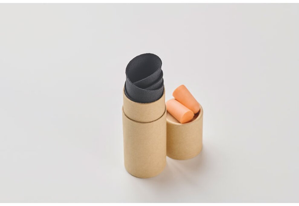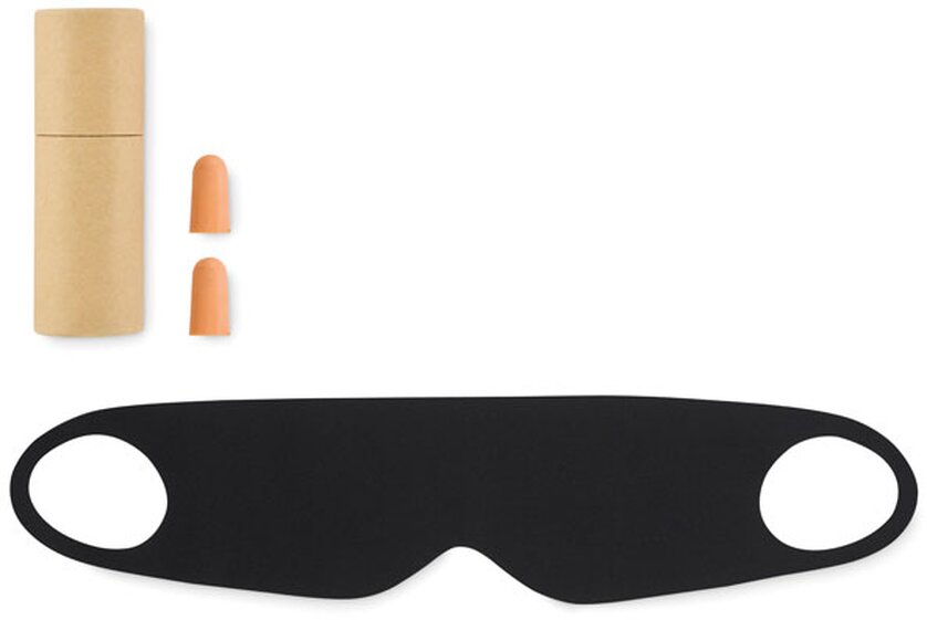 Cestovní sada obsahující elastickou polyesterovou masku na oči a špunty do uší z EVA.