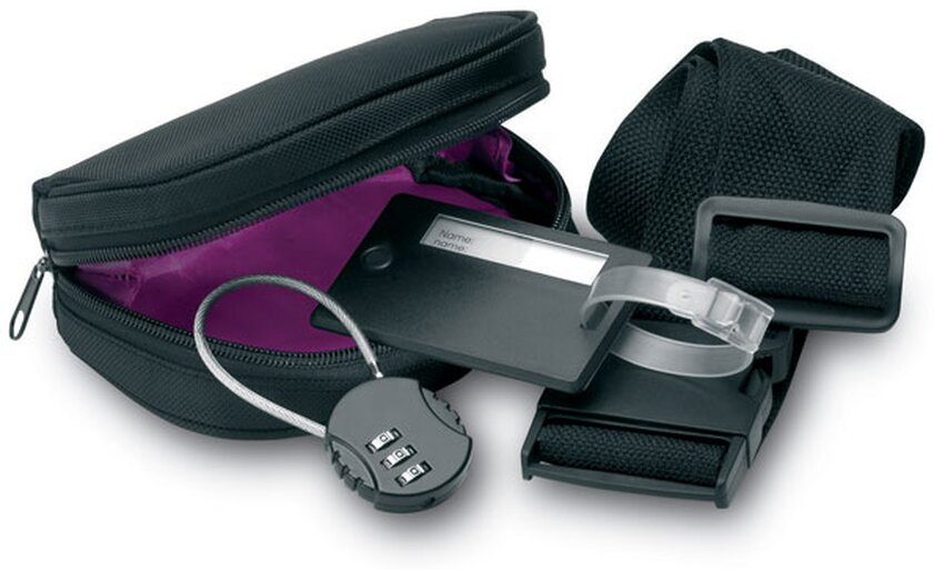 Cestovní sada obsahuje zámek na kufr, pásek na zavazadlo a jmenovku. Materiál 1680D polyester.