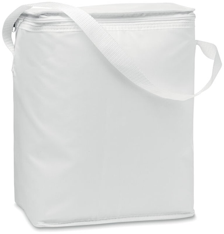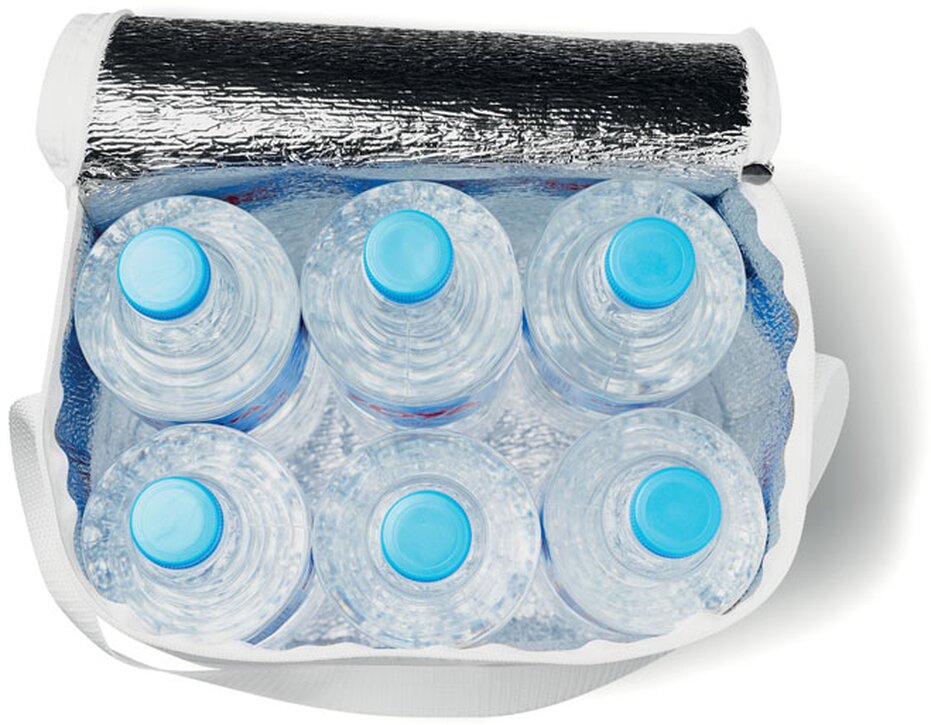 Chladicí taška z hliníkové folie na 6 láhví o objemu 1.5 l z 210 polyesteru. Zvenku netkané s bílými ozdobami. 80 g/m². Izolační materiál: Hliníková folie. Kapacita 12,5L.
