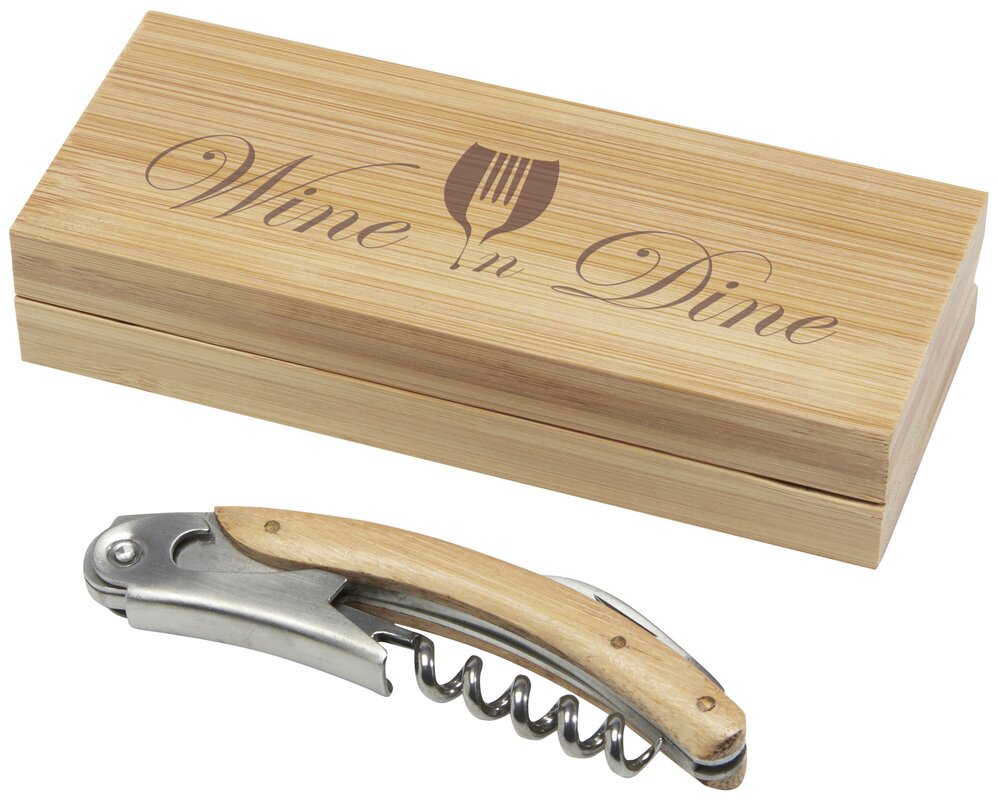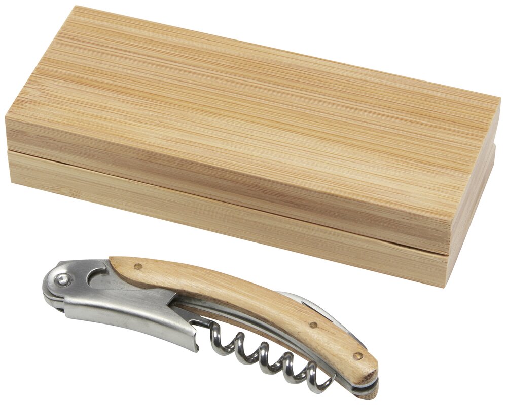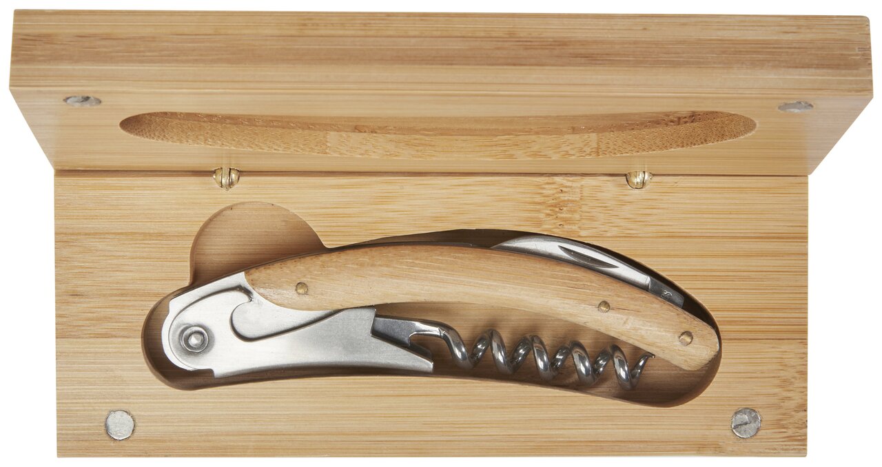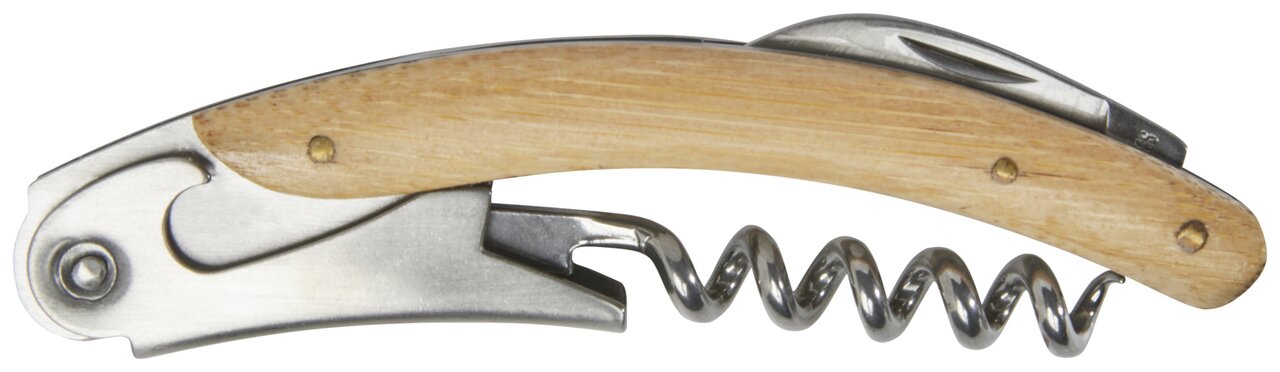 Číšnický otvírák z nerezové oceli s vývrtkou a zatahovacím fóliovým nožem s přírodním bambusem na rukojeti. Použitý bambus se získává a vyrábí v souladu se zásadami udržitelnosti.