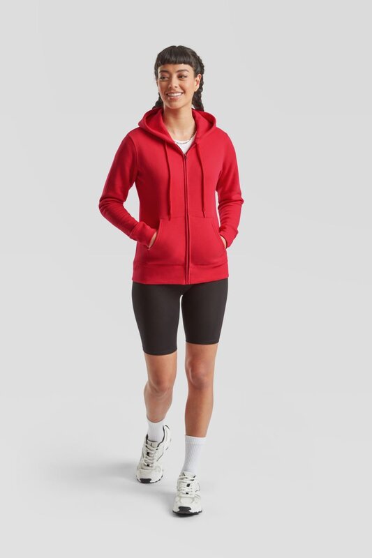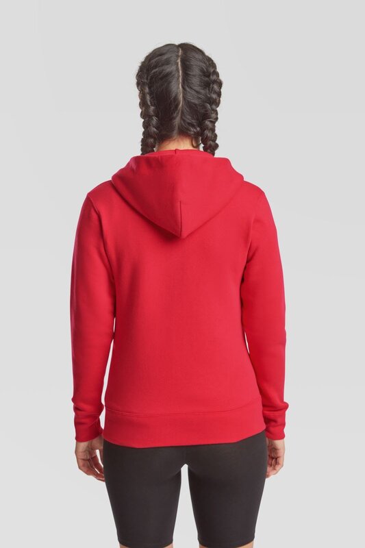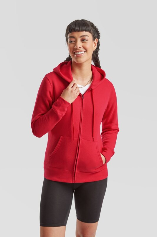 Dámská mikina Premium Lady-Fit kombinuje pohodlí, klasický střih a čistý design. Díky dvouvrstvé kapuci, skrytému zipu a praktickým kapsám je ideální pro každodenní nošení i týmové využití.
