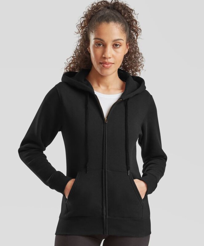 Dámská mikina Premium Lady-Fit kombinuje pohodlí, klasický střih a čistý design. Díky dvouvrstvé kapuci, skrytému zipu a praktickým kapsám je ideální pro každodenní nošení i týmové využití.