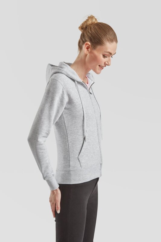 Dámská mikina Premium Lady-Fit kombinuje pohodlí, klasický střih a čistý design. Díky dvouvrstvé kapuci, skrytému zipu a praktickým kapsám je ideální pro každodenní nošení i týmové využití.