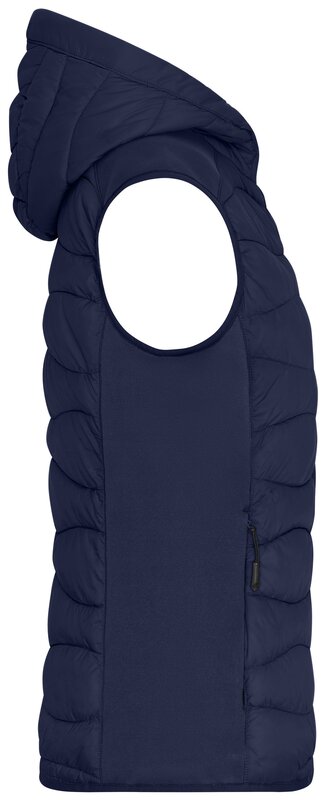 Sportovní vesta s kapucí a prošíváním, Prošívaný je přední a zadní díl a kapuce, Na bocích strečový fleece, Zip po celé délce, ochrana brady, Náprsní kapsa a boční kapsy na zip, 2 vnitřní kapsy, Velmi teplá díky výplni sorona®AURA, Značkové zipy - YKK