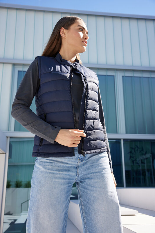 Dámská prošívaná a zateplená vesta, tkanina je snadno udržovatelná (z recyklovaného polyesteru). Díky BIONIC-FINISH®ECO odpuzuje vodu a nečistoty. Velmi teplá díky výplni sorona®AURA, Zip po celé délce (Značkové zipy - YKK), límec stojáček s drukem uprostřed. 2 boční kapsy na zip, vnitřní kapsa na zip.