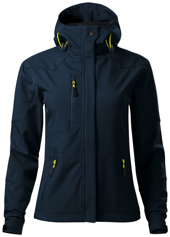 Dámská softshellová bunda s kontrastními detaily. Bunda má efektní texturu softshellu - úprava NANOtex® zabraňující průniku vody. Bunda má dvě přední kapsy a jednu náprsní kapsu na zip. Kapuce je na stažení šňůrkou, kapuce a spodní lemy rukávů jsou nastavitelné suchým zipem. Bunda má projmutý střih.