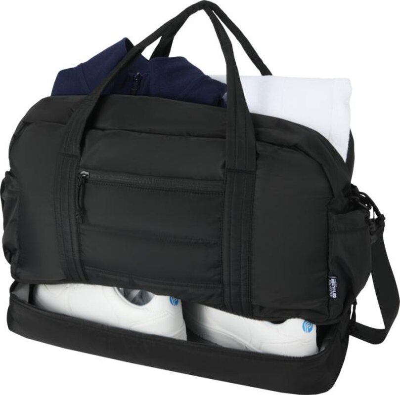 Sportovní taška Puffer kombinuje výrazný design s recyklovanými materiály s certifikací GRS pro každodenní praktické využití. Díky objemu 30 litrů je ideální pro krátké výlety, cvičení v posilovně nebo každodenní využití. Tato lehká a voděodolná sportovní taška je navržena tak, aby se bez námahy přizpůsobila vašemu životnímu stylu.