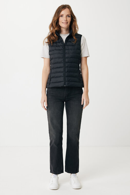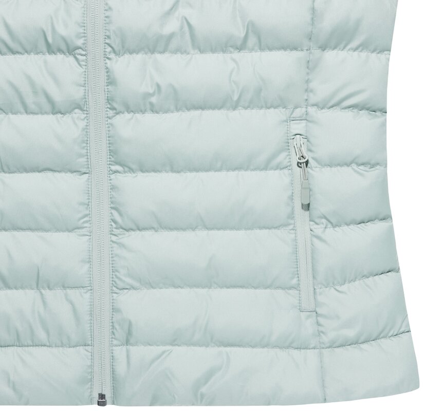 Dámská vesta vyrobená ze 100 % post-consumer recyklovaného polyesteru. Perlová výplň ze 100 % recyklovaného polyesteru. Oboustranný zip na přední straně, kapsy na zip po stranách. Tahače zipů v ladících odstínech. Průramky s elastickým lemováním s kompletně čistými švi. Vodě repelentní impregnace bez obsahu fluorinu/PFAS. Obsah recyklovaných materiálů je garantován díky využití technologie AWARE™, která kombinuje možnost skenování materiálu a technologii blockchain. Každý produkt Iqoniq vlastní unikátní štítek s QR kódem, který odkazuje na příslušný digitální pas produktu. 2 % z výtěžku každého prodaného kusu je darováno na Water.org. Certifikováno OEKO-TEX® STANDARD 100. Dostupné i v pánské variantě.