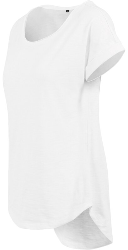 Zajímavé triko s prodlouženým zaobleným zadním dílem, hlubším kulatým výstřihem s efektem rolování. Triko má ležérní střih spadlých ramen s ohrnutím.