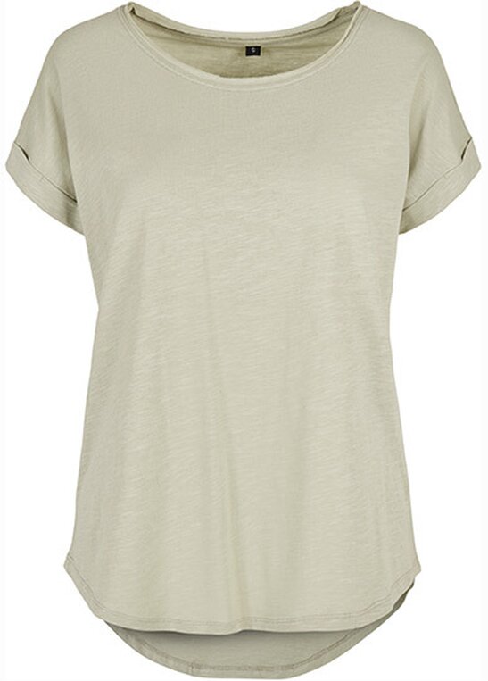 Zajímavé triko s prodlouženým zaobleným zadním dílem, hlubším kulatým výstřihem s efektem rolování. Triko má ležérní střih spadlých ramen s ohrnutím.
