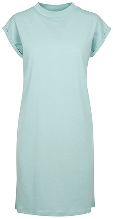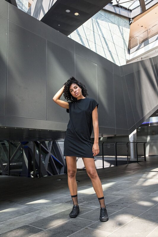 Stylový kousek mezi šaty a tričkem, který má rozšířená ramena, krátké ohrnovací rukávy a decentní mini stojáček, který dodává šmrnc. Ušité z příjemné bavlněné tkaniny (200 g/m²), která se dobře nosí i snadno udržuje.