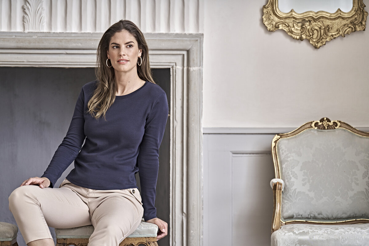 Kvalitní dámské tričko s dlouhým rukávem je šité dvojitým stehem a má žebrovaný lem výstřihu s lycrou. Tričko hezky sedí díky střihu Slim Fit.