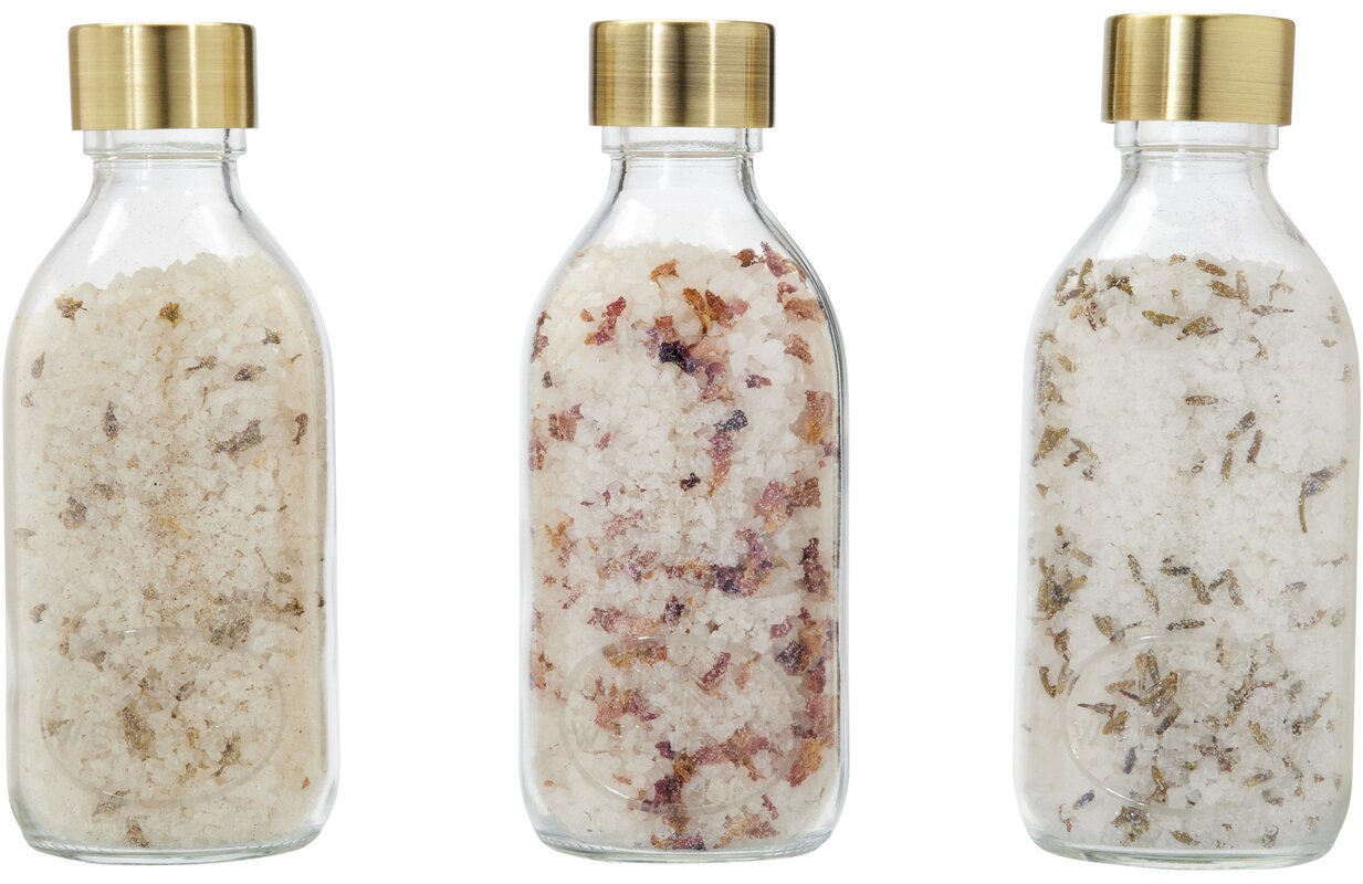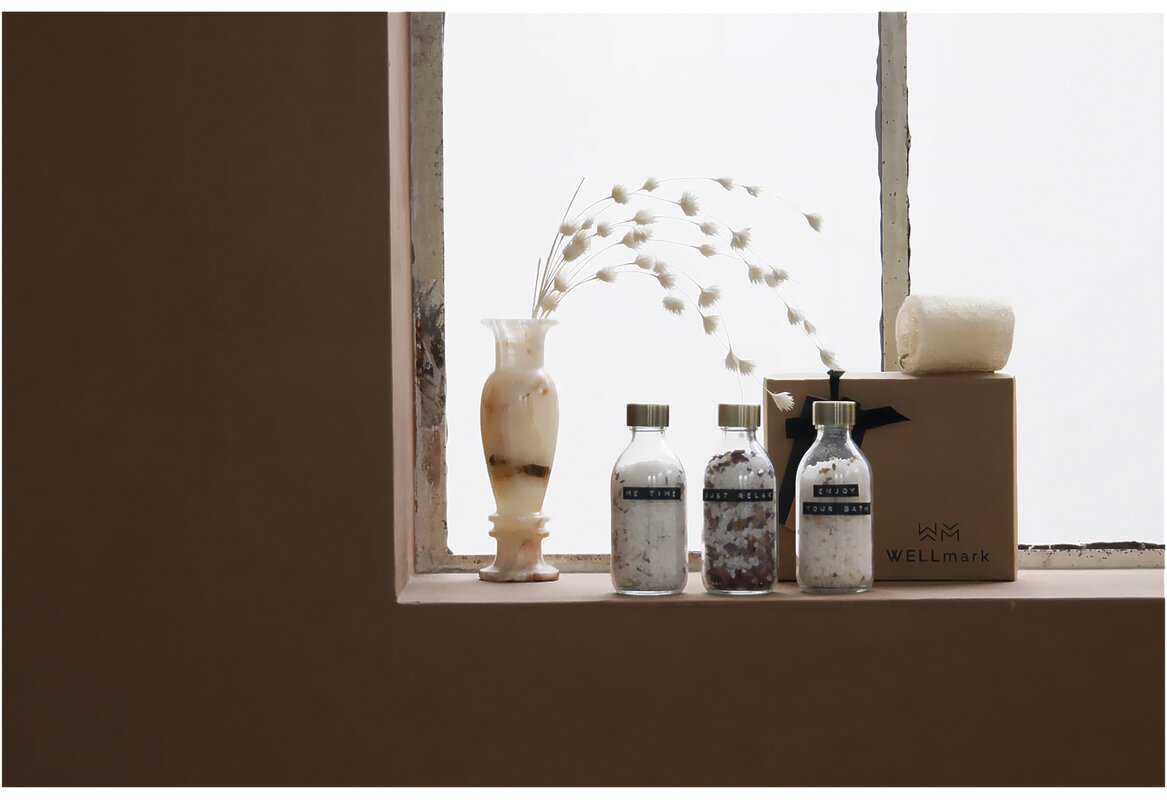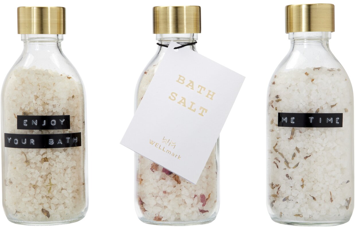 Dárková sada Just Relax - Wellmark. Obsahuje 3x 200 ml koupelové soli z Mrtvého moře v čiré skleněné lahvičce s ocelovým uzávěrem v mosazné barvě. Každá lahvička má jinou vůni: vůni růže, levandule a heřmánku. Nemáte doma vanu? Koupelovou sůl můžete také použít k osvěžení a uvolnění unavených nohou. Vyrobeno v Holandsku.