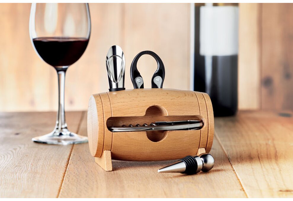 Dárková sada na víno BOTA zaujme zejména svým originálním podstavcem ve tvaru vinného soudku.