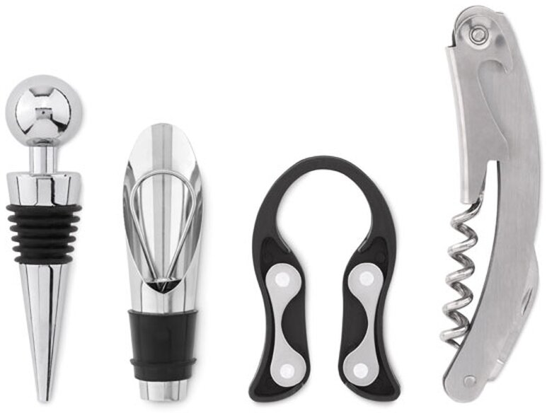 Součástí sady je číšnický nůž, řezačka fólie, zátka a nálevka na víno.