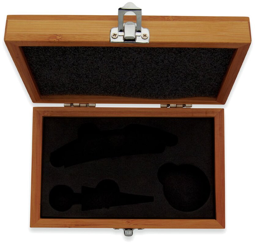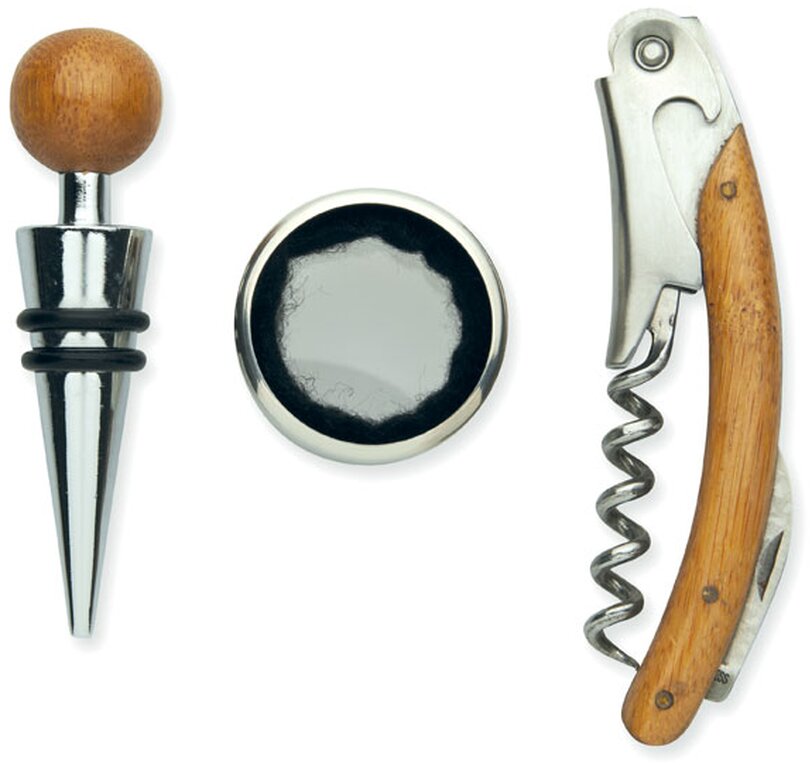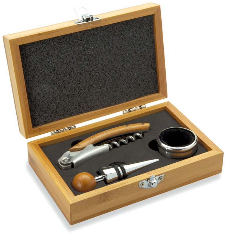 Sada na víno v bambusovém boxu obsahuje vývrtku, kroužek a zarážku z nerezové oceli a bambusu.