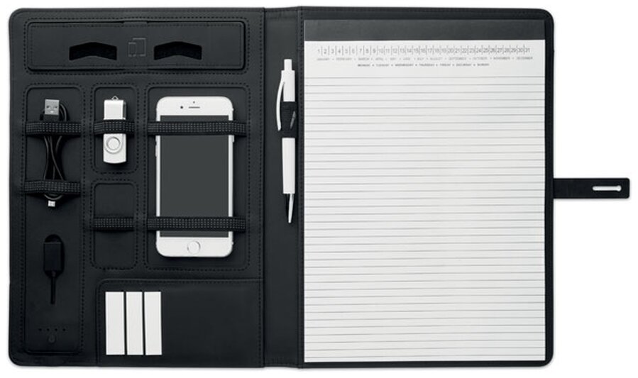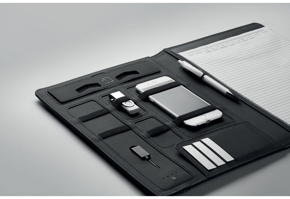SMARTFOLDER jsou chytré A4 desky na dokumenty s PU podšívkou obsahující DC5V/1A bezdrátovou nabíječku a powerbanku s kapacitou 4000 mAh. Součástí desek je rovněž micro USB kabel do konektoru typu C. Dále udělá radost přiložený dvacetistránkový blok a spousta vnitřních kapes na propisku, flashku, telefon a další potřebné drobnosti.
